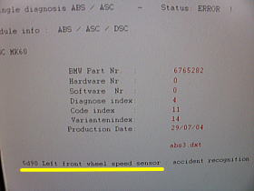 ![]() | コンピューター診断の結果、「左フロントABSセンサーの信号異常」が出ました。 |