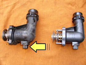 ![]() | 原因は、サーモスタットの矢印の部分が割れていたためです。 右が新品 あと、ブレーキパッド(DIXCEL)前後、バッテリー(BOSCH)、ミッションオイル・デフオイル・ブレーキオイル・エンジンオイルを交換しました。 |
