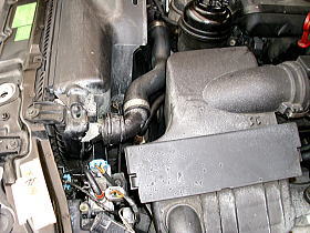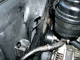 ![]() | ボンネットを開けてみると、クーラントが飛び散っています。 |