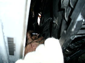![]() | この狭い隙間から、ファンを取り付けます。 |