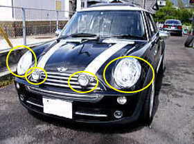 ![]() | 丸印の箇所、すべてハイビームが付きます。 |